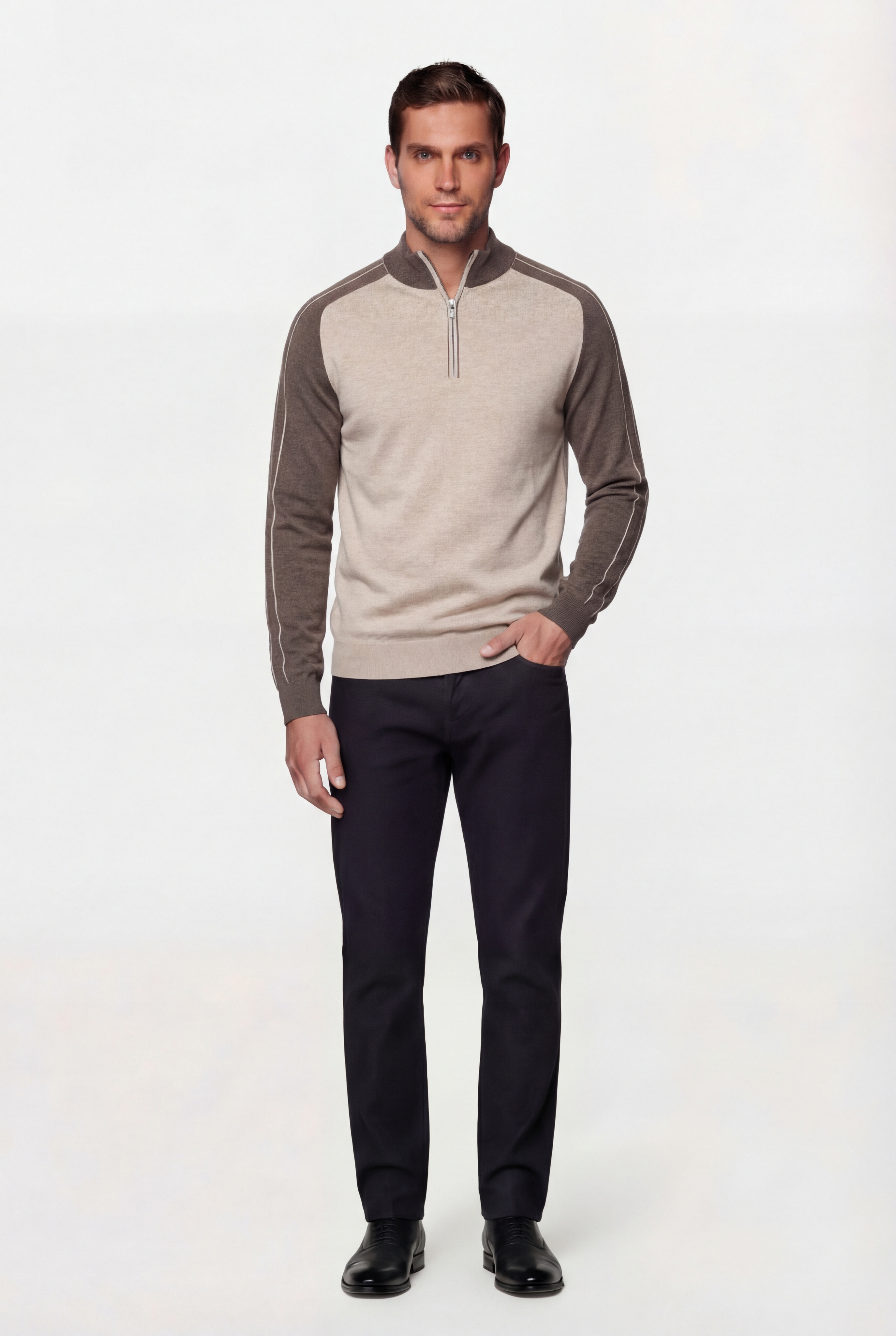 Джемпер CAIOMARIO полуприлегающего силуэта из высококачественной мериносовой пряжи «merino wool» с добавлением акрила и п/э, изделия из такой пряжи мягкие, гигроскопичные, устойчивы к пилингу и выцветанию, а так же мало подвержены усадке. Воротник высокая стойка. Застежка на короткой молнии. Низ изделия и рукавов на резинке. Прекрасно сочетается с джинсами и брюками . Стильная и элегантная вещь отлично подойдет для повседневной носки. Выбирайте качество, выбирайте стиль, выбирайте CAIOMARIO!
