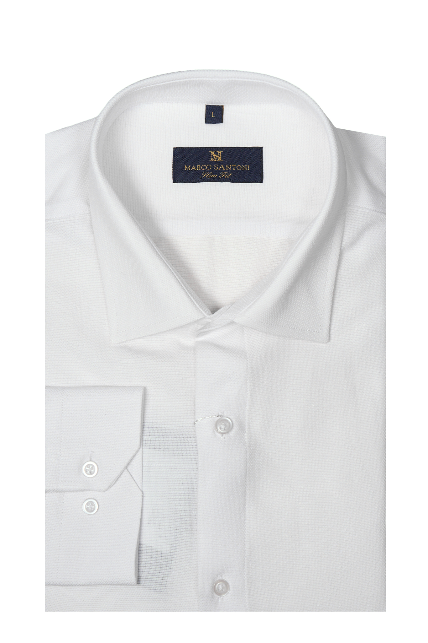 Мужская сорочка от бренда MARCO SANTONI — универсальная модель на каждый день. Сорочка выполнена из плотной и мягкой ткани с оптимальным сочетанием хлопка и полиэстера, такой состав делает рубашку одновременно мягкой, воздухопроницаемой и устойчивой к деформации. Хлопок обеспечивает естественный комфорт и правильную циркуляцию воздуха, а полиэстер позволяет ткани сохранять форму, меньше мяться и иметь более длительный срок службы. Благодаря этому рубашка долго остаётся ухоженной, не теряет цвета и отлично ведёт себя после множества стирок. Фасон Slim Fit — полуприлегающий силуэт, который не сковывает движения . Рубашка легко комбинируется с джинсами, брюками и костюмами, оставаясь базовой частью мужского гардероба. Качественная фурнитура, ровные швы подчёркивают надёжность модели. Мужская рубашка MARCO SANTONI — это сочетание классического стиля, качественных материалов и продуманной посадки, которая подходит практически каждому мужчине. Эта модель разработана для тех, кто ценит комфорт в течение всего дня, предпочитает практичные решения и хочет выглядеть аккуратно как в офисе, так и в более свободной повседневной обстановке.