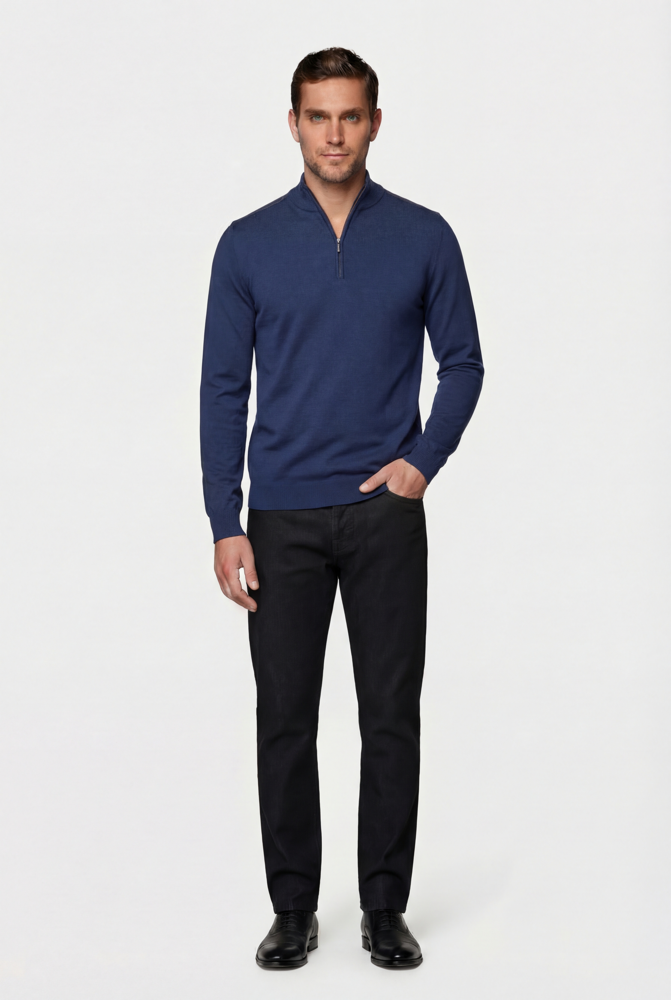 Джемпер CAIOMARIO полуприлегающего силуэта из высококачественной мериносовой пряжи «merino wool» с добавлением акрила, изделия из такой пряжи мягкие, устойчивы к пилингу и выцветанию, а так же мало подвержены усадке. Воротник высокая стойка. Застежка на короткой молнии. Низ изделия и рукавов на резинке. Стильная и элегантная вещь отлично подойдет для повседневной носки.