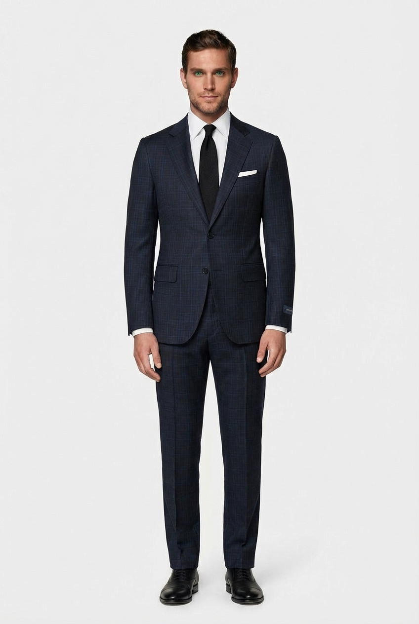Классический мужской костюм приталенного силуэта из полушерстяной французской ткани с матовым эффектом. Пиджак однобортный, две шлицы. Застежка на две пуговицы. Воротник классический, отложной, на лацкане имеется фасонная петля. Край лацкана, воротник, клапаны карманов декорированы отделочной строчкой «вспушка» (имитация ручного стежка). Два боковых кармана с клапанами, нагрудный карман «листочка». Рукава со шлицами на 4 пуговицы пришитые внахлест. Четыре внутренних кармана, один застегивается на пуговицу. Брюки прилегающего силуэта, два боковых кармана, два задних кармана с застежкой на пуговицу, на поясе предусмотрены шлевки для ремня. Подкладка: 100 % вискоза. Отличный вариант на каждый день.