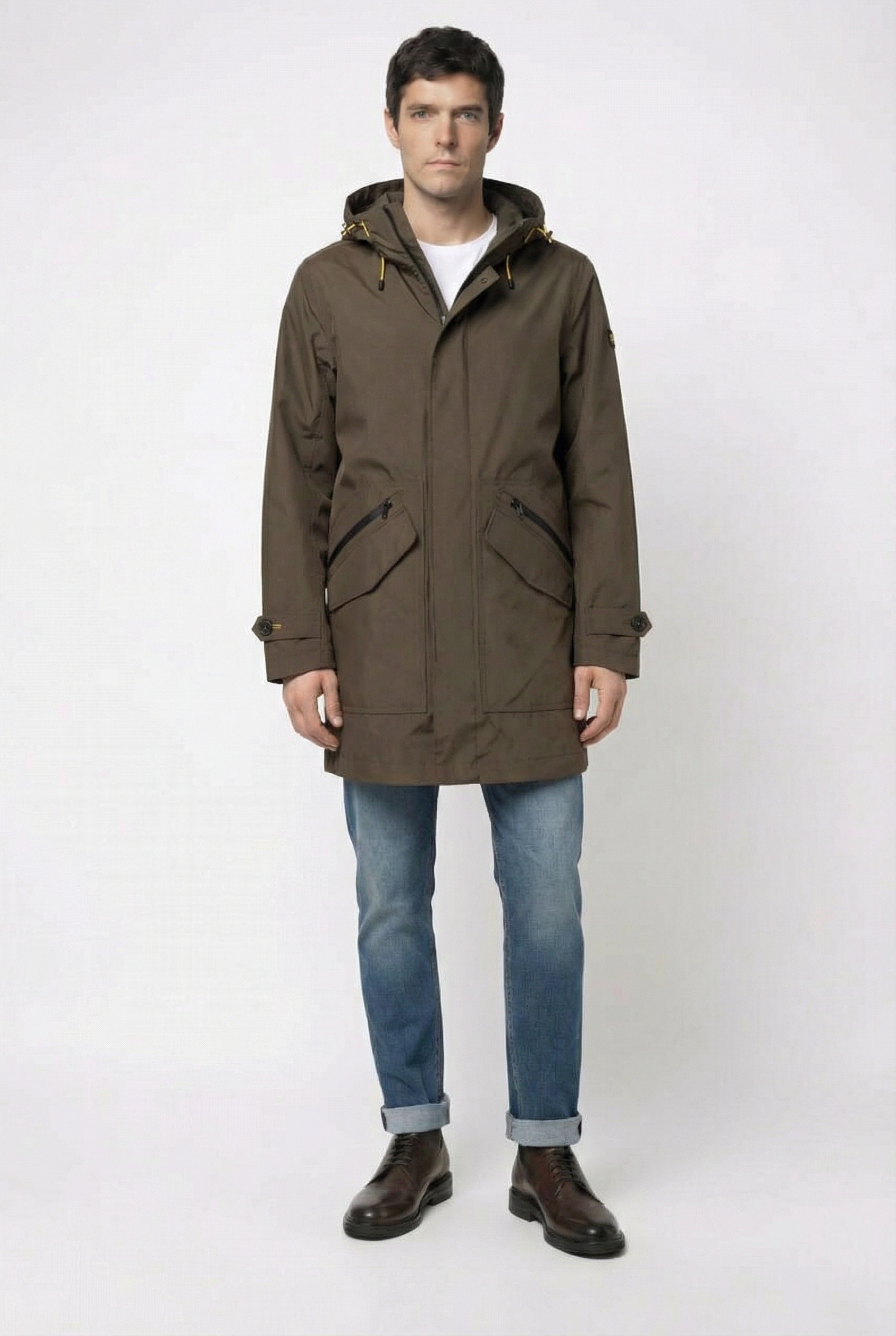 Плащ с капюшоном прямого силуэта из ветрозащитного, водонепроницаемого материала с обработкой «Water-repellent». Капюшон с утягивающей кулисой. Застежка на молнию и ветрозащитный клапан на кнопках. Ширина рукава регулируется хлястиком с пуговицей. Регулируется по талии внутренней кулисой. Четыре боковых кармана ( два с застежкой на молнии и два с клапанами и застежкой на кнопки). Два внутренних кармана (один с застежкой на молнии). На левом рукаве фирменный логотип. Без подкладки. Отлично подходит для повседневной носки.