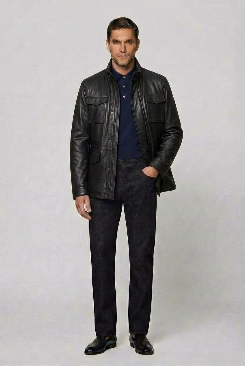 Куртка прямого силуэта из премиальной натуральной кожи ягненка «CROSS» Застежка на молнию и ветрозащитный клапан на кнопках. Воротник-стойка с отделкой из трикотажа внутри. Манжет рукава с застежкой на пуговицах. Внутри рукава отделка из трикотажа. Четыре наружных кармана с клапанами и застежкой на кнопки. Два вместительных внутренних кармана с застежкой на молнии. По талии утягивающая кулиса. В изделии использована эксклюзивная японская фурнитура. Декоративная отделка из натуральной замши. Подкладка из ткани с технологией 4D (хлопок + вискоза) прекрасно тянется во все стороны, это дает дополнительный комфорт в носке. Предусмотрены две шлицы с застежкой на кнопки. Куртка прекрасно подходит для повседневной носки.