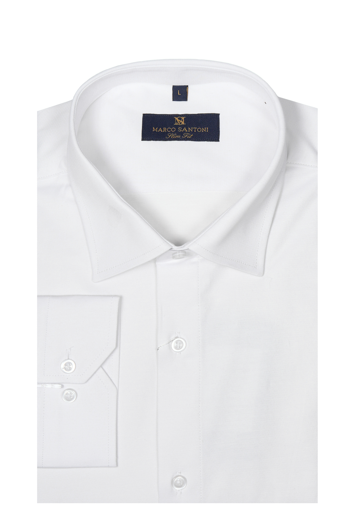 Мужская сорочка от бренда MARCO SANTONI — универсальная модель на каждый день. Сорочка выполнена из плотной и мягкой ткани с оптимальным сочетанием хлопка и полиэстера, такой состав делает рубашку одновременно мягкой, воздухопроницаемой и устойчивой к деформации. Хлопок обеспечивает естественный комфорт и правильную циркуляцию воздуха, а полиэстер позволяет ткани сохранять форму, меньше мяться и иметь более длительный срок службы. Благодаря этому рубашка долго остаётся ухоженной, не теряет цвета и отлично ведёт себя после множества стирок. Фасон Slim Fit — полуприлегающий силуэт, который не сковывает движения . Рубашка легко комбинируется с джинсами, брюками и костюмами, оставаясь базовой частью мужского гардероба. Качественная фурнитура, ровные швы подчёркивают надёжность модели. Мужская рубашка MARCO SANTONI — это сочетание классического стиля, качественных материалов и продуманной посадки, которая подходит практически каждому мужчине. Эта модель разработана для тех, кто ценит комфорт в течение всего дня, предпочитает практичные