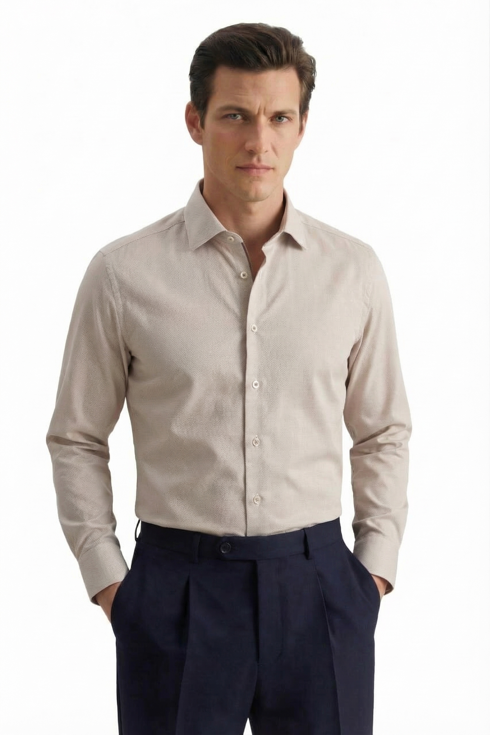 Рубашка без кармана. Регулируемый манжет. Прекрасно сочетается с классическим костюмом, джинсами и трикотажем. Отличный вариант для повседневной носки.